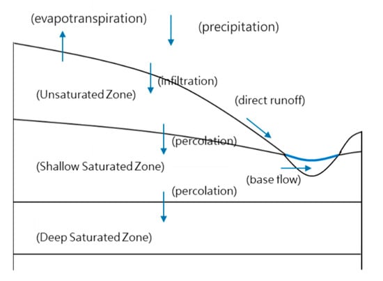 To evaluate the bias of the watershed runoff simulation, the Generalized Watershed Loading Function (GWLF) (Haith et al., 1992) [] was used in this study. The input of GWLF water balance mechanism is mainly from precipitation. When the rainfall reaches the ground, part of the rainfall goes underground through the infiltration mechanism, and some forms direct runoff. The infiltration rainfall supplements the water of the unsaturated zone. When the soil moisture in the unsaturated zone reaches the field capacity, the excess water will pass through the percolation mechanism to the shallow saturated zone, and finally the shallow saturated zone will produce base flow. The stream flow is the sum of the direct runoff and base flow. The concept of the water balance model is illustrated in Figure 4.