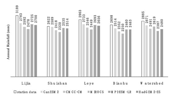 Comparing the rainfall data of the four rainfall stations with five selected GCMs in the baseline (1976–2005) period, the rainfall data of five selected GCMs are underestimated compared to the four stations, with an average underestimation of about 12% and the largest gap being more than 20%. The average rainfall of the watershed calculated with grid data (Thiessen’s Polygon Method) is also underestimated, with an average underestimation of about 13% (Table 4). The annual rainfall comparison between the station data and the GCM data is shown in Figure 5.