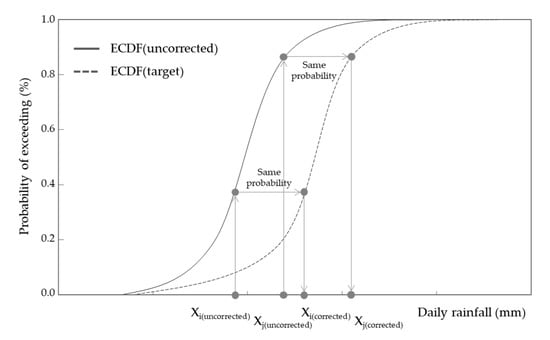 First, the ECDF curve of the daily rainfall data (wet days) of the GCM baseline period and the ECDF curve of the station daily rainfall data (wet days) are calculated, and then the GCM baseline period daily rainfall events are corrected according to the ECDF value corresponding to the station daily rainfall data. The schematic diagram of bias correction is shown in Figure 6.