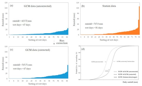 Example of quantile mapping bias correction and the bias of wet days. (a) demonstrates the sample of uncorrected GCM data in a certain month, (b) demonstrates the sample of station data in the same month, (c) demonstrates the sample of corrected GCM data in the same month, and (d) shows the correction process of ECDF of sample data. The bias correction corrects GCM data from (a–c), by considering the ECDF characteristic of station data (b). The bias correction makes the ECDF of GCM data corrected to match the ECDF of station data (d), therefore correcting the rainfall value, but the number of wet days is still unchanged.