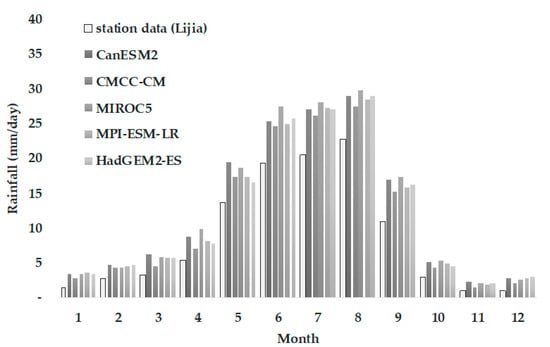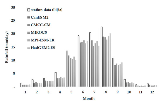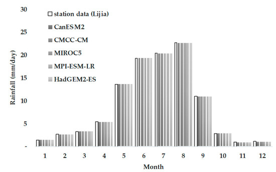 For the bias correction results of the No-Threshold method, the daily rainfall of the five GCMs was significantly higher than the station data (Figure 8). The results of the Fixed-Threshold method were lower than the station data (Figure 9), and the Optimized-Threshold method produced results basically identical to the station data (Figure 10).