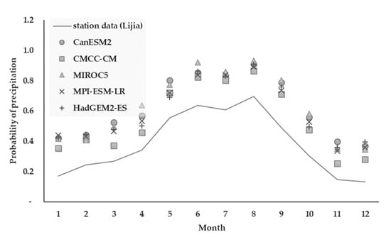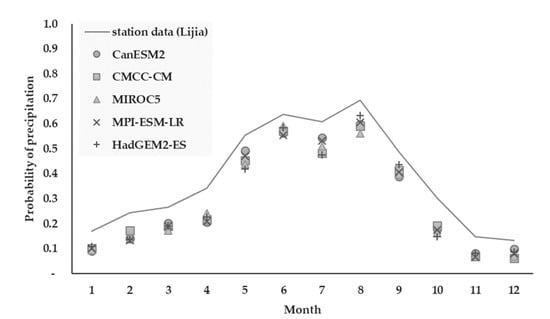 In addition, this study assumes that the probability of precipitation of the station data under the same location is equal to that of the GCM data. A numerical method is used to make the two sets of data equal. Although the correction result can be achieved, it does change the number of physical rainfall events in the GCM. The number of wet days in the GCM data is reduced, and some rainfall events are missing, because such rainfall events are below the threshold and calculated as dry days.