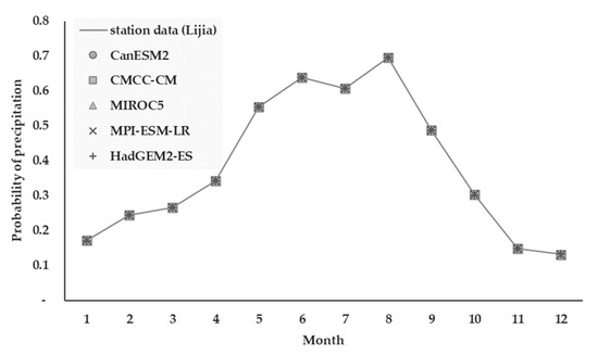 This study also presents the difference in the probability of precipitation (number of wet days/total number of days) in the results of the three correction methods. With the No-Threshold method, the probability of the GCM data was significantly higher than the station data, so the bias correction results were overestimated (Figure 11). With the Fixed-Threshold method, it was generally lower than the station data; therefore, the correction results were underestimated (Figure 12). With the Optimized-Threshold method, the rainfall probabilities of the two groups of data were identical, so the correction results were basically the same (Figure 13).