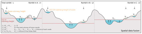 Hydrologic models, as the basic tools to estimate the peak volumes and flood peaks [12], have been widely studied by scholars in the field. There are two types of hydrologic models today. One is the performance evaluation models and the stormwater-management models, with complicated data such as soil infiltration and drainage network as the input. The simulation or prediction performance is subject to the high-precision survey of temporal-spatial patterns and the accurate prediction of the rainfall. However, it can be challenging to obtain such data for a city. Even if the data are obtained, they can hardly generate accurate simulation results. Therefore, these models are seldom adopted to predict the rainwater runoff within a large-scale space [13,14]. In addition, the output of these models is not included in the indicators of the urban comprehensive plans [15,16]. The other type is the GIS-based hydrologic scenario simulation widely used in large-scale urban planning. Models are established to calculate and simulate the submerged areas and water depths during different storm recurrence periods. Combined with typological, precipitation, and drainage models, these models generate the distribution patterns of the waterlogged areas [17,18,19]. The SCS-CN model is designed by the Soil Conservation Service under the United States Department of Agriculture (USDA-SCS) to simulate the flood peaks and runoff volumes of the floods brought about by extreme weather within a small basin. This ready-to-use runoff calculation model takes the relationships between runoff volumes and precipitation, soil types, land use and management conditions, weathers, and soil moistures into consideration. Empowered by GIS toolkits, the SCS-CN model is able to identify the areas that are vulnerable to flood, the submerging volumes, and the submerging depths within a city based on the results from the flood-submerging simulation experiments. The model is widely applied now [20,21]. However, some studies have shown that this method cannot effectively determine the impact of precipitation storage and consumption on runoff, which limits the accuracy of runoff prediction by this method [22,23]. At the same time, it is established based on the assumption that all rainwater submerges the lowest point gradually, which deviates from the actual rainfall-submerging scenes [24,25]. To make up for this deficiency, this study innovatively designed the swale identification experiment to improve the SCS-CN model.