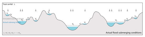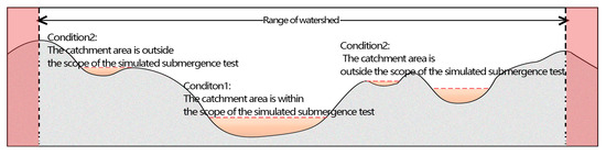 This experiment took precipitation and infiltration processes into consideration, examining the flood-submerged conditions under different rainfall. However, the catchment capacity of the regions other the flood-submerged areas was not simulated. After getting the rainfall, the rainwater was filled into the thresholds from the lowest point until they were submerged completely, which deviated from the actual precipitation process.