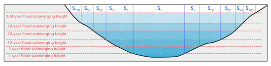 (i) When the catchment was within the simulated flood-submerged area, the catchment capacities during different return periods were calculated as below: