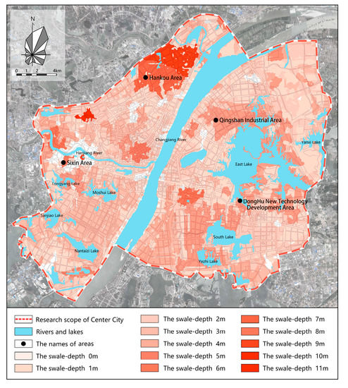 A total of 25,894 swales were identified in downtown Wuhan (Figure 7). The depth of each swale equaled the difference between the overflow point and the bottom point (Due to the poor resolution of the urban-space data and the urban-property data, the accuracy of the swale depth was 1 m. The error in the results was significant.) (Figure 8). The simulated results of the 1-year, 5-year, 10-year, 20-year, 50-year, and 100-year flood-submerged area were obtained, with the flood-submerged elevation of each watershed in downtown Wuhan listed in Appendix A Table A3.