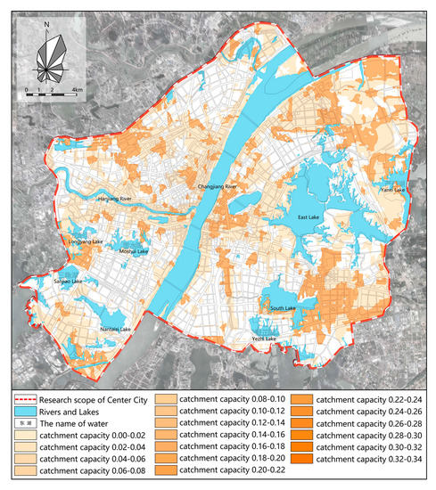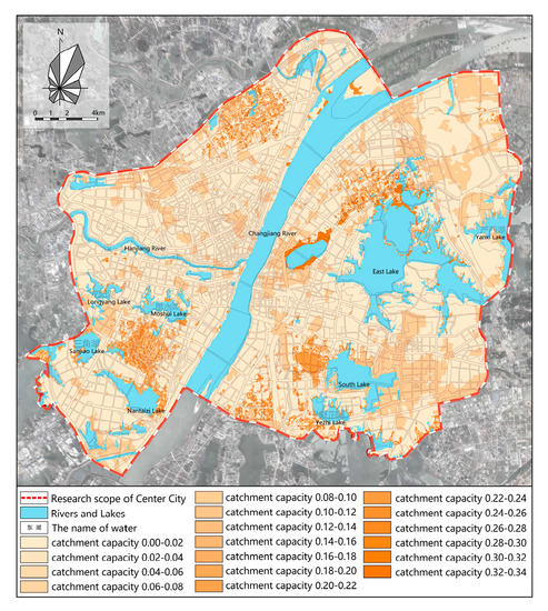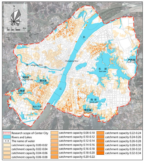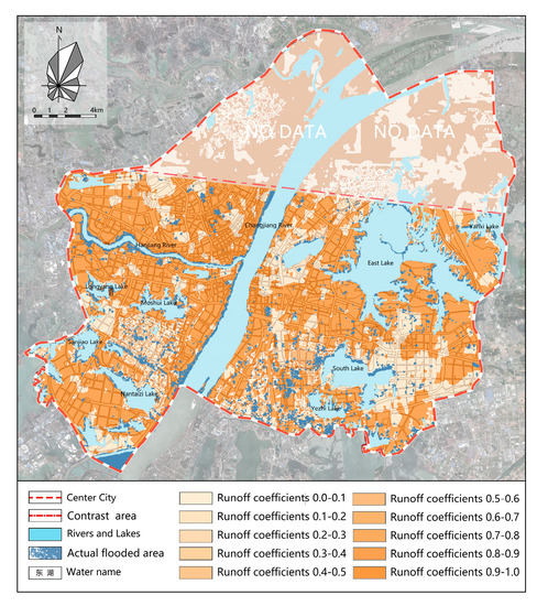 The flood threshold of Wuhan is 0.15 m (within 1 h). The maximum comprehensive surface runoff coefficient of each lot in downtown Wuhan was calculated based on the catchment-capacity results.