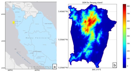 The study area and the CoastalDEM of Penang Island. (a) the study area is presented by a yellow color, and Peninsular Malaysia is presented by blue color; (b) the DEM of CoastalDEM with 90m spatial resolution.