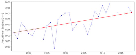 As has been demonstrated in Jakarta [], Vietnam [], and Shanghai [], rising sea levels play an important role in flooding, shoreline erosion, and hazards from storms. Particularly, in South-East Asia, most of the population lives in densely populated coastal areas. In Malaysia, a previous study showed a 1-m rise in sea level would result in the loss of 7000 km2 land area []. As it is an important industrial center, Penang Island has experienced an average sea level rise rate of 3.2 mm/year over the past three decades, as shown in Figure 2. Within this trend, the sea level is likely to rise 320 mm to 7320 mm above 2000 levels by 2100. Even so, land subsidence models are not considered. Therefore, most coastal lands would be submerged because of the relatively low elevation.
