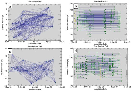 The time-position and time-baseline configuration of SBAS-InSAR interferometric pairs from descending track (a,b) and ascending track (c,d), respectively. The yellow dots denote the super master image, and the green dots are the slave images. Blue lines represent interferometric pairs.