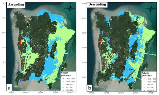 The average deformation rate maps of the SBAS-InSAR technique from ascending (a) and descending (b), respectively. The negative values indicate land subsidence, while the positive values indicate uplift.