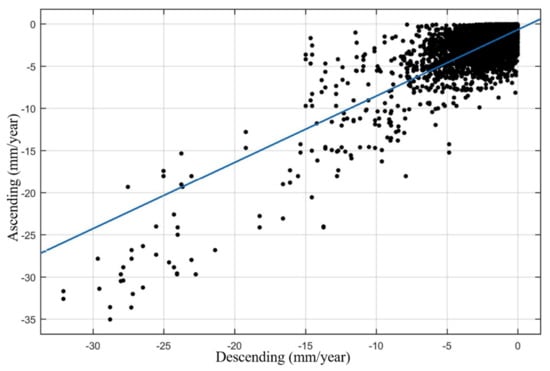 Due to the lack of other geophysical data and only one GPS station in the study area, regression analysis was used to verify the self-consistency of both tracks. In order to use InSAR results with greater efficiency, 100,000 random points were firstly created by ArcGIS software. Then, using both ascending and descending results to assign value to those random points, and null values have been removed. Figure 5 shows the linear regression analysis result in the subsidence areas, the linear coefficient determination (R2) is close to 0.65. This is to indicate the annual deformation rates acquired from two tracks may differ but still be correlated. These differences can be caused by mainly several factors: horizontal movement of the ground targets, unmatched position, and the errors of the SBAS-InSAR technique itself.