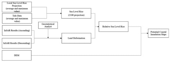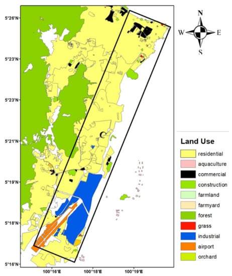 In Penang Island, the influences of both sea-level rise and tsunami on potentially inundated areas were analyzed in []. The results concluded that 30% of coastal land would be submerged in the worst-case tsunami inundation model, meanwhile, most people live in these areas. However, tsunamis, typhoons, and earthquakes are rare because of their special geographical location, and the study still fails to provide an analysis of the growing local land subsidence rate.