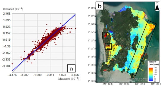 The land deformation monitoring was performed through the combination of ascending and descending results by applying the geostatistical analyst method. Figure 8a shows the linear regression analysis of predicted and real data, the RMSE is 0.43 and the standard R-square is 0.95. This means that the predicated and real data are closely aligned, thus the predicated data can reflect the deformation for both tracks. Figure 8b shows the results of land deformation rates over the period January 2018 to August 2020, negative values indicate land subsidence in the vertical direction, while positive values represent vertical land uplift.