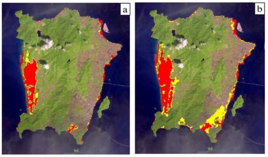 Inundation map for Penang Island under different projections by 2100. (a) the inundated area under the lowest effect level; (b) inundated area under the highest effect level. The results of sea-level rise are shown in red, and the cumulative impacts of sea-level rise and land subsidence are shown in yellow.