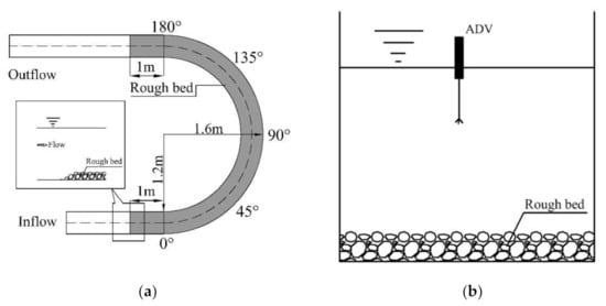 Curved channels are commonly found in natural rivers around the world. Flow in curved open-channel follows a helicoidal path and induces a secondary flow, which can redistribute mass, momentum, boundary shear stress and thereby plays an important role in hydraulic engineering [1,2]. Considerable studies focused on the curved channel characteristics in different ways, including theoretical derivation, field observations and measurements, physical model experiments, and numerical simulations. For example, Zeng et al. [3] showed that the turbulent kinetic energy in the channel bend is significantly larger than that at the entrance and the exit according to laboratory experiments. Blanckaert [4] and Blanckaert and Vriend [5] found that water surface gradient and streamwise curvature variations are the major factors for velocity redistribution in sharp bend channels. Vaghefi et al. [6] indicated that there are two persistent clockwise vortexes from the streamlines drawn in cross sections and the maximum shear stress occurs from the entrance of the bend to the bend apex area near the inner wall. However, these studies only focus on flow over smooth curved channels, and the hydrodynamic characteristics over a curved and rough bed, more consistent with practical field conditions, has been paid less attention and is not well-understood [7].