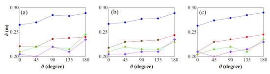 Water depth variations along the curved reach for four cases: (a) Q = 0.015 m3 s−1, (b) Q = 0.025 m3 s−1, and (c) Q = 0.030 m3 s−1 (● Bare case; ■ Small case; ▲ Middle case; ♦ Big case).