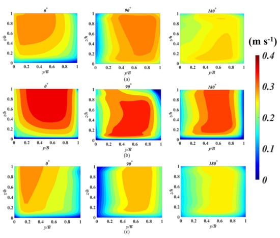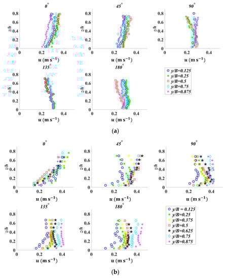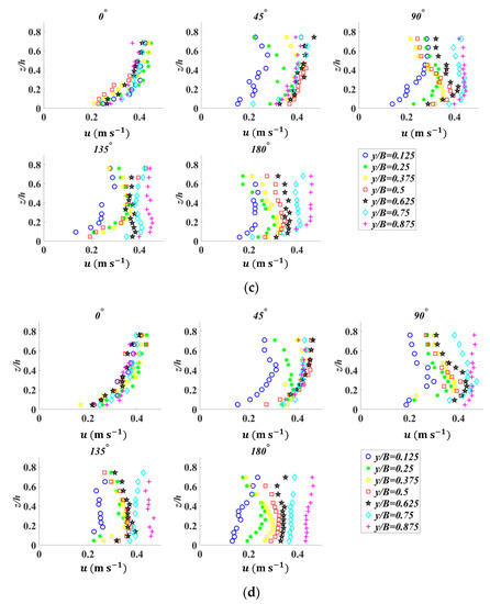 Figure 3 shows the longitudinal velocities along the depth of each section for smooth beds (bare case) and rough beds (small case, middle case and big case) for Q = 0.030 m3 s−1. For smooth bed (bare case, Figure 3a), the longitudinal velocity along the water depth at 0° and 45° sections follows logarithmic distribution, similar to the case in straight open channels. At the cross sections of 90° and 135°, the flow is affected by the channel bend. The longitudinal velocity gradually increases in the bottom region () and reduces in the top region (), thus breaking the logarithmic distribution law. Consequently, the longitudinal velocity as shown in Figure 3a exhibits an approximate “constant” distribution along the water depth as Blanckaert [37] and Barbhuiya and Talukdar [38] found.