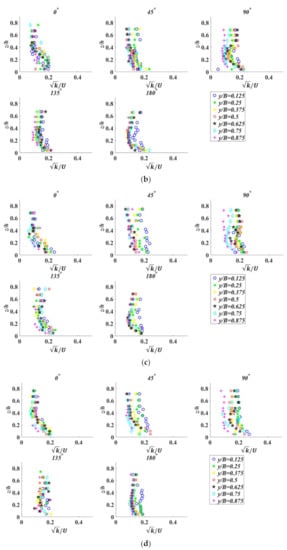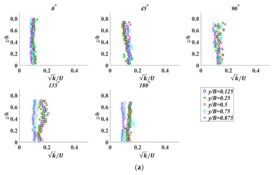 Taking Q = 0.030 m3 s−1 as an example, the TKE profiles, normalized by the overall mean velocity , under different tough bed conditions are shown in Figure 4. For the bare case (Figure 4a), the normalized k values show a constant distribution along the water depth for each cross section, but the normalized k values gradually increase from inlet (0° section) to the apex of bend (90° section) and decrease from the apex to outlet (180° section). The intense turbulence mainly concentrates in the cross section of 90°–135°. The reason is that the friction of the wall and the momentum exchange between the water flow and the wall leads to the increase of k values [4].