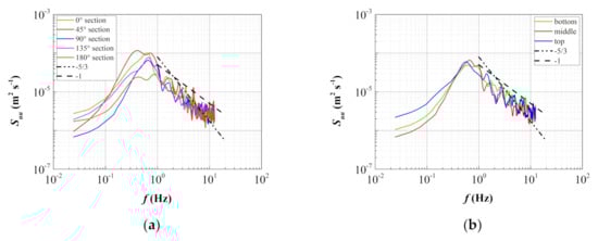 For the bare case (Figure 5a), the PSD value for the high-frequency part at the 45° section is the greatest, while the PSD value at the 180° section is the smallest, indicating that the turbulence becomes strong, and the high-frequency (small-scale) vortex increases due to the influence of channel bend. For Figure 5b, there are similar trends for different positions for the bare case, which means the structures of turbulent vortex along vertical directions are approximately identical over smooth bed.
