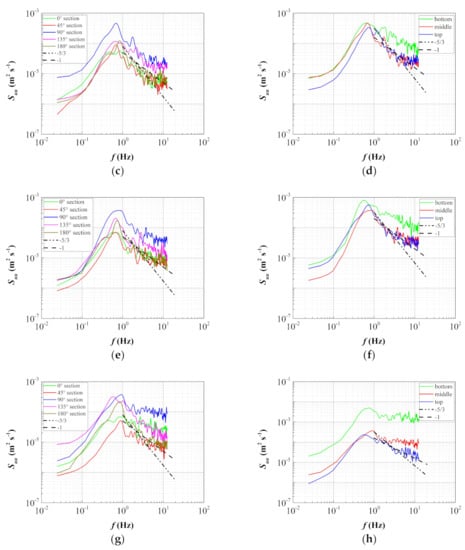 Figure 5 presents the variations in the power spectral density (PSD) of longitudinal velocity fluctuation with frequency f for different experimental conditions measured at the mid-width of the flume (20 cm from inner bank). Since the flow discharge has little effect on PSD, the discharge Q equal to 0.030 m3 s−1 is used as an example to reveal the variations of PSD. The spectral analysis used here is based on the Welch method with Hamming type windowing [42]. In Figure 5a,c,e,g, the feature point was measured at mid-depth (12 cm from the bed). In order to explore the effect of distance from the channel bed on PSD, three characteristic positions, i.e., 2 cm (bottom), 12 cm (middle) and 16 cm (top) from bed along the vertical direction, are provided at the 90° section in Figure 5b,d,f,h. Due to the limitation of ADV frequency, the energy input, inertial subrange and part of dissipation range can be observed. However, the higher frequency (part of dissipation range) is unable to present. Therefore, some of the small-scale turbulent structure can still be investigated.