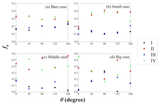 Figure 6 shows characteristic distributions of the occurrence frequency fk in different cases for Q = 0.030 m3 s−1 as an example. The feature point is measured at the distance of 0.01 m from the bed in the vertical direction and 0.20 m from the inner bank (center of the flume) in the transverse direction in each section to investigate the turbulent event near bed. For the bare case (Figure 6a), it can be observed that sweep and ejection events (event II and IV) occur with comparable frequency and are much higher than outward and inward interactions at the 0° section, indicating that upwards motion of low-speed fluid and downwards motion of high-speed fluid are dominant. After the 45° section, the frequency of occurrence of events of I and III quadrants become higher. At the 180° section, the frequency of occurrence for four events is similar. This reveals that high-speed fluid reflects by the bottom and low-speed fluid is pushed back as the influence of channel bend, showing a strong interaction of the turbulent structures with the main flow. For rough bed cases, it is noted that higher magnitude of sweep and ejections (event II and IV) contributions as shown in Figure 6b (small case) similar to the bare case at the 0° section. When flow enters the curved channel, the frequency of occurrence for event II and IV increases, indicating that sweep and ejection are the most dominant processes, which can potentially influence the sediment transport in the stream, causing the exchange of energy and momentum in the flow and the bed formation. The middle case (Figure 6c) performs the similar trend as the small case. However, for the big case (Figure 6d) the frequency of occurrence for event II and IV decreases first (0° section to 90° section) and then increases (90° section to 180° section). Therefore, the contributions of sweeps and ejections are more important than those of the outward and inward interactions over a rough bed, which are the same results obtained by other researches in straight channels [43,49]. Bed roughness is the leading factor to the turbulent bursting in curved channels when the grain size of bed particles is moderate (the small case and middle case), but for the big case the turbulent bursting is weaken before the apex of the bend. The possible explanation is the larger grain size of bed particles possible disturbs the bottom boundary layer, changing turbulent structure near the bed.