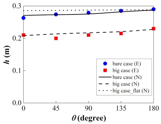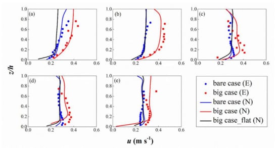 Figure 8 performs the longitudinal velocity profiles at the mid-width of the flume (20 cm from inner bank) under different cases. The simulated velocity distribution at the 90° and 135° section does not fit very well with the experimental results, especially for the big case. For big case_flat, the longitudinal velocity near bed decreases due to the bed friction when compared with the bare case. On the other hand, the longitudinal velocity for the big case_flat is smaller than that for the big case owing to larger water depths.