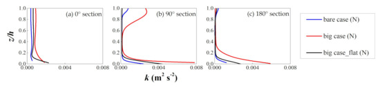 The distributions of k at the mid-width of the flume (20 cm from inner bank) at three typical cross-sections (0°, 90° and 180°) are shown in Figure 10. For the 0° section (Figure 10a), the k values of three cases are smaller near the free surface but become larger near the rough bed regions, implying that rough bed will enhance fluid mixing and strengthen turbulence. Additionally, the k values of the big case_flat are slightly larger than those of the big case. For the 90° and 180° sections (Figure 10b,c), the k values firstly increase (from 0° section to 90° section) and then decrease (from 90° section to 180° section), indicating that the channel bend can also improve turbulence along the water depth, especially near the bed regions. However, the k values of the big case (red line) increase more than the other two cases along the curved channel. The result suggests that the bed roughness and curved channel both improve turbulence along the water depth, especially near the bed regions, which is the same as the experimental results. Additionally, the thick sediment layer can promote TKE more than the curved channel does.