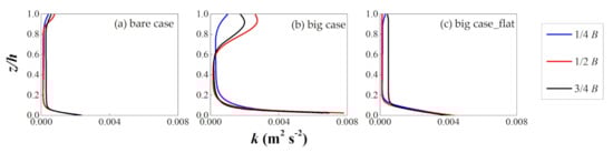In order to explore the effect of distance from the convex bank on the distributions of k, three characteristic positions, i.e., ¼cm (=1/4 B), ½cm (=1/2 B) and ¾cm (=3/4 B) from the convex bank along the transverse direction, are provided at the 90° section for three cases as shown in Figure 11. For the bare case (Figure 11a), the k values of three lines basically collapse together, meaning that the transverse positive has little effect to the k values for the smooth bed. For the big case (Figure 11b), the k values near convex bank is slightly larger when z/h = 0.1–0.6. The thick sediment layer with bed roughness strengthens the turbulence more near convex bank, which is the same as the experimental result. However, for the big case_flat (Figure 11c), the k values near concave bank at z/h > 0.1 is larger. The thick sediment layer increases the TKE (k) values, especially near convex bank.
