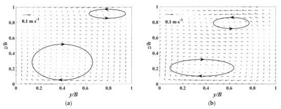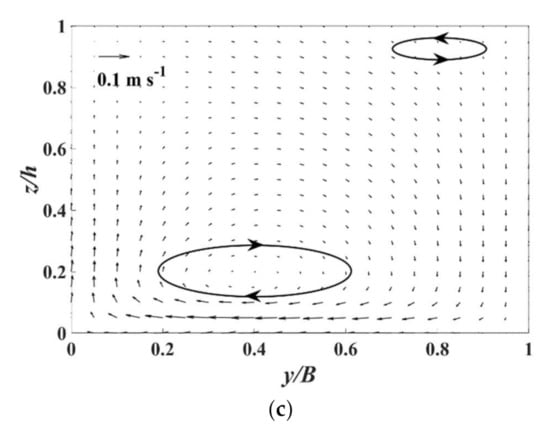 The secondary flow that can interact dynamically with the primary flow is important for meandering rivers and useful for studies of diffusion and navigation in natural waterways, because it is partly responsible for the large-scale bed topography of natural alluvial channel bends [51]. The vector of the cross-stream motion (v, w) at the 90° section is shown in Figure 12. For the bare case (Figure 12a), there is a classical helical motion obviously, called the center-region cell. In addition, a weaker counterrotating cell of cross-stream circulation, called the outer-bank cell, exists in the corner formed by the water surface and the outer bank as Blanckaert and Graf [2] revealed. The center-region cell plays an important role in the advective momentum transport, and the outer-bank cell is believed to be crucial to bank erosion processes [52]. For the big case (Figure 12b), the center-region cell and outer-bank cell still exist. The center-region cell is confined to the near-bed area, and the outer-bank cell is stronger than that for the bare case, possibly accelerating the bank erosion. This is because the rough bed disturbs the flow, mainly reducing the longitudinal flow velocity near bed, and also affecting the distribution of the transverse velocity along the water depth. For the big case_flat (Figure 12c), the center-region cell is confined to a smaller area compared to the bare and big cases, which means that the thick sediment layer can influence more riverbed regions. Furthermore, the outer-bank cell is weaker than that for the big case.