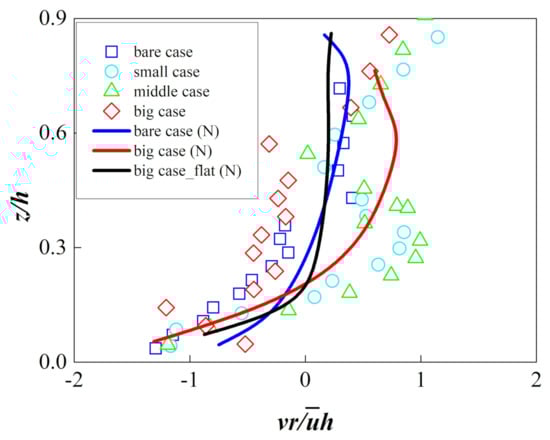 From Figure 13, it can be seen that numerical simulations (solid line) are close to experimental measurements (individual symbols). The slope of transverse velocity distribution for the big case is steeper than that for the bare case, which means that the rough bed would strengthen the secondary flow and possibly causes more riverbed erosion. Besides, the position of calculated values ( = 0) for the big case is lower than that of the bare case, representing the secondary flow is confined to the near-bed area as the results discussed above. For the big case and big case_flat, the slope of transverse velocity distribution is comparable, i.e., similar secondary flow intensity.