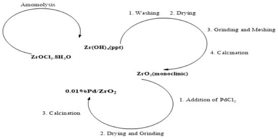 The incipient wetness technique was used for the preparation of the catalyst (0.01 wt.% Pd/ZrO2). First of all, aqueous solution of 2 mL of PdCl2 (5.1 × 10−5 M) was added to 10 g of ZrO2 to prepare a paste. The paste of the sample was then dried overnight in an oven at 110 °C. After this, the sample was crushed and meshed (passed via 170 and 200 µm US standard mesh sieves) and then calcined at 750 °C in the furnace at 0.5 °C/min for 3 h. The overall scheme of synthesis is presented in Figure 2.