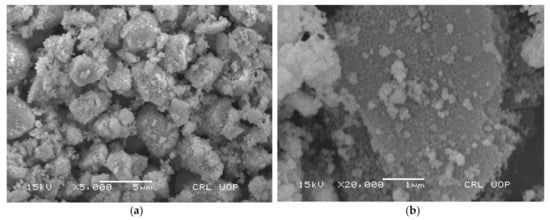 SEM images of Pd/ZrO2 at different magnifications of: (a) 5000×, (b) 20,000×.