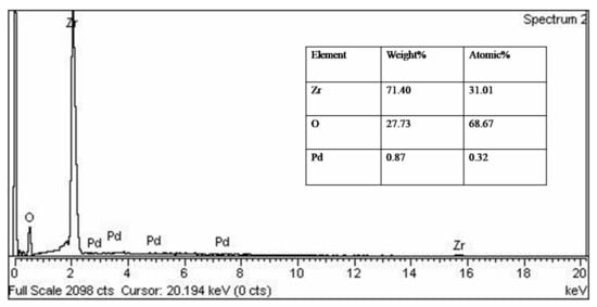 The EDX spectrum reveals that the catalyst consisted only of palladium and zirconium dioxide, which are presented in Figure 4. The elemental composition of the catalyst is also shown in the EDX spectra in the Figure 4.