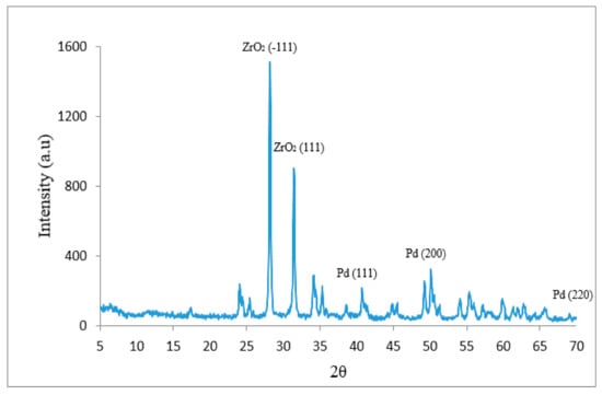 The palladium zirconia X-ray diffraction pattern is shown in Figure 5, which indicates the crystalline structure of catalyst. Major peaks of monoclinic zirconia were observed at 2θ values of 28.7° and 31.9°. The broad peaks representing zirconia, while some minor peaks were assigned to Pd. The palladium peaks are not prominent as their concentration in sample is low (0.001% w/w). Similar results have been reported in previous studies as well [].