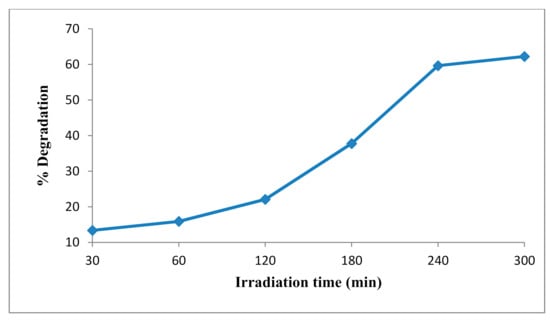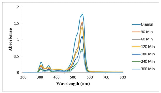 The time-effect on % degradation of dye was checked at different time intervals, e.g., 60, 120, 180, 240, and 300 min at 303 K temperature. At 1 mL hydrogen peroxide addition to 10 mL solution of dye, the degradation of rhodamine-B increased with time. Its UV-visible spectra are given in Figure 6 and the maximum degradation (Figure 7) of dye was achieved after 5 h, which was considered as optimal reaction time.