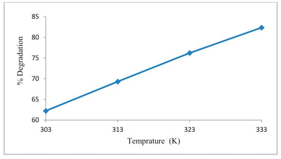 The effect of temperature on RB degradation by Pd/ZrO2 catalyst was explored at different temperatures like 303, 313, 323, and 333 K at 5 h. The catalyst amount chosen was 0.020 g and dye solution applied was 10 mL (15 mg/L) during the experiments. The increase in temperature increased the % degradation of dye and the optimum temperature was found to be 333 K, as depicted in Figure 8.