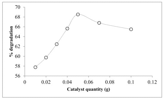 The catalyst surface provides reaction sites for the degradation. The effect of the amount of catalyst was investigated in the range of 0.01–0.1 g. It is clear from Figure 9 that the % degradation of dye increased up to catalyst quantity of 0.05 g and beyond this quantity degradation efficiency decreased because of the surface saturation. The optimum catalyst was thus taken as 0.05 g, which was used in the subsequent experiments.