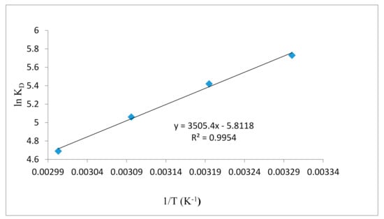 By plotting lnKD verses 1/T (K−1), the slope and intercept values obtained (Figure 10) were used for ΔH and ΔS calculation, respectively, which are given in Table 2.