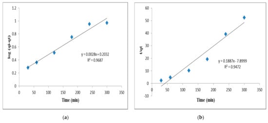 (a) Pseudo 1st order kinetics model; (b) pseudo 2nd order kinetics model.