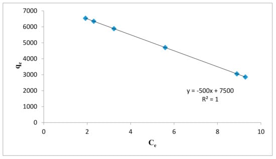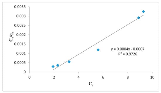 where the Ce is the concentration at equilibrium (mg/L), qe is the adsorbed amount (mg/g), KL and aL are the constants of Langmuir isotherm, which show the maximum sorption ability (mg/g) and strength for bonding, respectively. The theoretical monolayer capacity (Qo) is numerically equal to KL/aL. Langmuir adsorption isotherm was plotted with Ce/qe against Ce and a line with correlation coefficient of 0.9726 (R2) was attained (Figure 13).