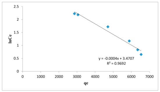 where B = RT/b, R is gas constant (8.314 J/mol K), b is the Temkin constant, which is related to the heat of adsorption (J/mol), A is the Temkin isotherm constant (L/g), and T is the absolute temperature in Kelvin. The graph was plotted qe versus lnCe and a linear curve was obtained with the slope B and intercept B lnA (Figure 14). The numerical values of the isotherm models used are given in Table 5.