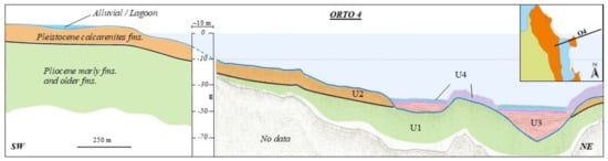 Lacking useful well data, the main seismic horizons and units have been calibrated (Figure 5) through the comparison with the outcropping successions [,,,,]. In fact, all the dip seismic profiles terminate very close to the coastline (sometimes <10 m) and, therefore, represent the natural offshore prosecution of the sedimentary deposits outcropping on land. In particular, the on-land stratigraphic features of the eastern part of the Marzamemi peninsula have been compared with the western termination of seismic line Orto 4 (Figure 5).