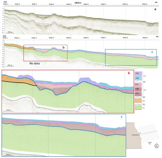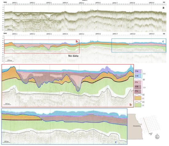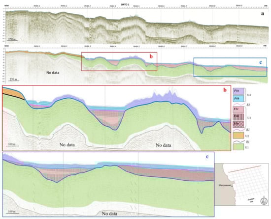 (a) Seismo-stratigraphic interpretation of the Orto 5 profile, located in the central study area. (b) Seismo-stratigraphic interpretation of the central portion of the Orto 5 profile. (c) Seismo-stratigraphic interpretation of the northeastern portion of the Orto 5 profile. Legend: refer to Figure 6.