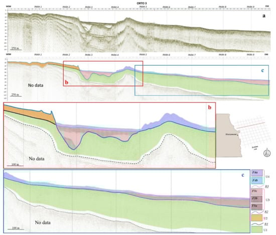 (a) Seismo-stratigraphic interpretation of the Orto 3 profile, located in the northern study area. (b) Seismo-stratigraphic interpretation of the central portion of the Orto 3 profile. (c) Seismo-stratigraphic interpretation of the northeastern portion of the Orto 3 profile. Legend: refer to Figure 6.