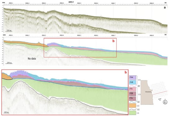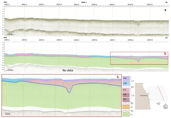 (a) Seismo-stratigraphic interpretation of the Orto 7 profile, located in the central study area. (b) Seismo-stratigraphic interpretation of the central portion of the Orto 7 profile. Legend: refer to Figure 6.