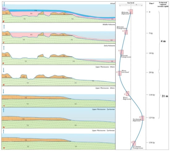 The regional tectonic uplift that occurred in the time interval between the Würm lowstand (20 ky ago) and Holocene highstand can be estimated in about 4 m, thus its contribution to the transgressive phase can be considered negligible (Figure 13e–g).