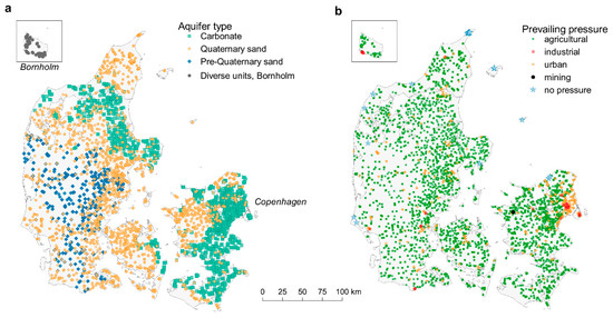 Sampling points in Denmark classified on the basis of (a) aquifer type and (b) prevailing pressures.