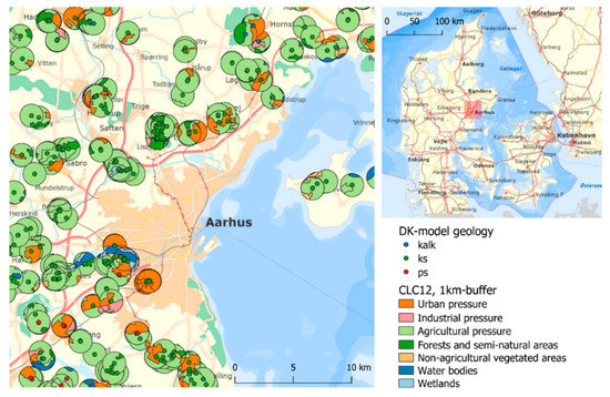 Example of 1 km buffer around sampling points. Abbreviations in DK model geology: kalk—carbonate aquifers; ks—quaternary sand, ps—pre-quaternary sand (figures from [56]).